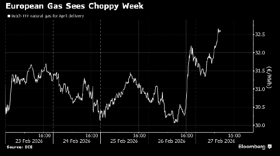 周五,截至阿姆斯特丹时间下午1:39,基准荷兰天然气4月交割合约上涨1.6%,报每兆瓦时32.66欧元,合约价格有望实现周涨幅。